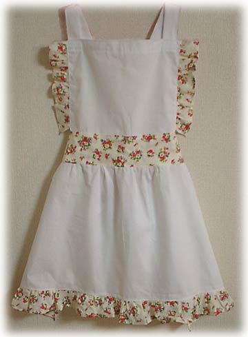 花柄フリルいっぱいのエプロンドレスです。ドレスを着たい女の子の夢をお手伝いするために作りました。
