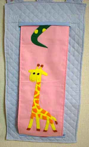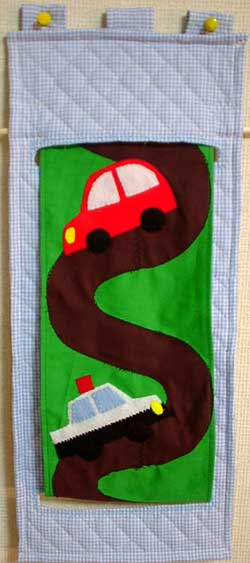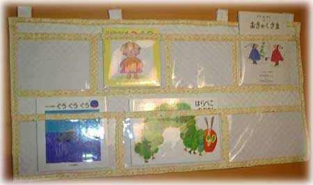 壁にかけて、絵本を入れておきます。ビニール素材を併用して表紙を見えやすくしました。絵本大好きな子が増えるといいですね。
