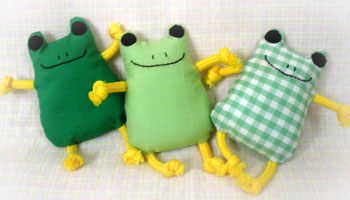 かえるの形のにぎにぎ。手足がロープでできている愛嬌者。おなかを押すと音がでます。