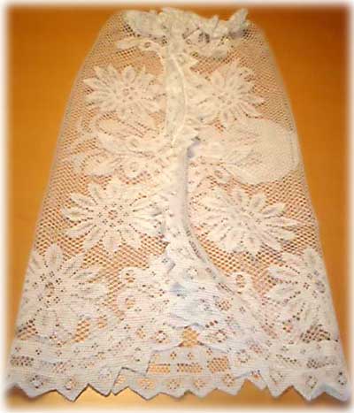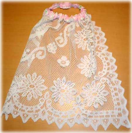 レースのスカートと組み合わせれば、あっという間にかわいい花嫁さんのできあがり。100円ショップのテーブルクロスを1/4にカットして作りました。安い…。