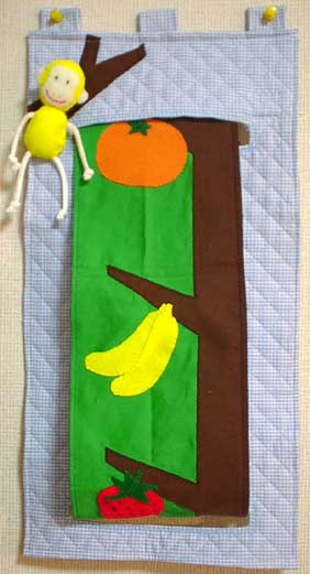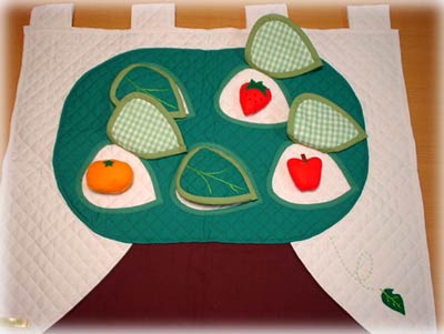大きな木のかたちのタペストリー。葉っぱの下に色んなくだものが隠れています。くだものは取り外して、場所を変えたり、ままごとにも使えます。