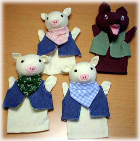 三匹のこぶたとオオカミの子ども用指人形。子どもの手のサイズのハンドパペットです。物語が始まるかな?大人の手サイズのこぶたのお母さんも登場!