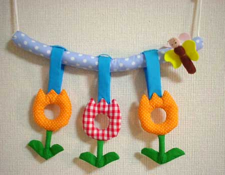 はじめはベッドオーナメントとして。チューリップは取り外せるので、にぎにぎとしても使えます。ちょうちょをはずして、チューリップの輪をくぐらせて遊ぶことができます。