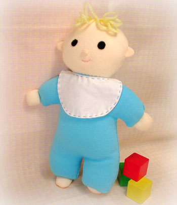 赤ちゃん人形の作り方 1. 材料 ニット生地(スムース)・・・白 20cm×20cm 水色 20cm×40cm 毛糸(並太)・・・黄色 80cm×2本 (=髪の毛) 綿生地・・・白 12cm×24cm 目ボタン・・・2個 8mm 綿 色糸・・・白・ピンク・水色 2. 型紙イメージ 3. 作り方 80cmの毛糸は、それぞれ8分の1に折り、片方の根元で一結びする。 「耳」は二つ折りにし、耳の形に細かく縫い、裏返す。 2枚の「頭」に、毛糸の束と耳を挟み、首の部分を残して周囲を細かく縫う。 「頭」を裏返し、綿を詰める。 髪の根元を押さえるように、上から縫っておくと良い。(髪の毛が立たないように。) 「鼻」は、2cm角の布の中を円形にぐし縫いし、糸を引いて縮め、余った四隅を内側にいれて丸くする。 目ボタンと「鼻」をとれないようにしっかり縫い付ける。 口はピンクの糸2本どりでバックステッチで刺繍する。 「手」・「足」はそれぞれ二つ折りにして手足の形に縫い、裏返して、3分の2ぐらいまで綿を詰める。 「体」2枚に「手」・「足」を挟み、首部分を残して周りを細かく縫う。 「体」を裏返し、綿を詰める。(柔らかめに) 首を体に入れて、まつりつける。 スタイの作り方 「スタイ」2枚を重ね、返し口を残して、周囲を縫う。 返し口から裏返し、返し口をまつる。 水色の糸2本どりで、周囲にステッチをかける。 「スタイ」を首に巻き、後ろで縫いとめる。