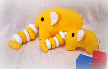 ぞうの作り方 1. 材料 ニット生地・・・黄・白 フェルト・・・水色 綿ロープ・・・(太)15cm (並)7cm 綿 刺繍糸 2. 型紙イメージ 3. 作り方 綿ロープ(並)の両端に、結び目を作る。 胴2まいに綿ロープ2本を挟み、返し口を残して、周囲を半返し縫いで縫う。 2.を裏返し、綿を詰めて、返し口をかがる。 目・耳をつける。 綿ロープ(太)の先を挟んで、リング留めを筒に縫う。 5.をピンセットで裏返し、綿をつめて棒状にし、両端をかがる。 「マシュリング」を5個作る。 「マシュリング」の作り方 半返し縫いで、細長く、筒状に縫う。 ピンセットで裏返し、綿をつめる。 伸ばしながら、リング状にし、かがる。 注意! 取り外しのできる小さい部品は誤飲・窒息の恐れがあります。赤ちゃんに与えるときはリングを本体からはずさないようにしてください。