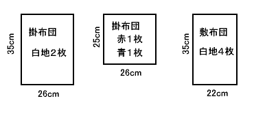人形用お布団の作り方 1. 材料 布・・・白 70cm×70cm 赤系(柄) 25cm×26cm 青系(柄) 25cm×26cm レース・・・52cm 綿 2. 型紙イメージ 3. 作り方 レースを挟んで、白地と柄を縦につなげて縫う。 中表に二つに折り、返し口を残して縫う。 表に返し、綿を詰めて、口をかがる。 2枚を合わせ、返し口を残して縫う。 表に返し、綿を詰めて、口をかがる。