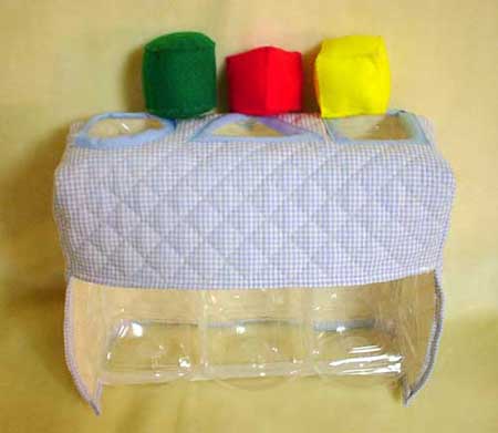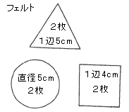 型抜きパズルの作り方 1. 材料 フェルト・・・赤、黄、緑 各10×16cm 綿 刺繍糸 キルティング・・・42×36cm バイアステープ 平ゴム・・・25cm ペットボトル1リットル角型・・・3本 透明ガムテープ ※ペットボトルは種類によってサイズが異なるかもしれません。 ここでは、「お〜い!お茶」の1リットルペットボトルで作成しています。 2. 型紙イメージ 3. 作り方 !!!ペットボトルを切るときは怪我のないよう充分注意しましょう!!! フェルトで型○△□を作る。 フェルトを組み合わせ、まつりぬいをする。 綿を詰めて、縫い閉じる。 △と□の側面の角になるところは、縫い目でなくてもまつりぬいをする。 キルティングでカバーを作る。 ○△□を切り抜き、切り口をバイアステープでくるむ。 前面の裾を1cm内側に折って縫う。 A-A’,B-B’,C-C’をあわせて縫う。(縫い代1cm)左側も同様に。 側面・後面の裾を1cm内側に折って縫う。 側面の裾に平ゴムを渡して、縫い付ける。 ペットボトルを組み立てる。 ペットボトルの上部を切り落とす。(下から19cm) ペットボトルの前面、後面(図の赤の部分)に切り込みを入れる。線が太くなっている部分は切り落とす。 前面を内側に折りこみ、突起部分を折り曲げて後面の切りこみに差し込む。(これで傾斜が固定される。) 同じものを3個作り、透明ガムテープなどで貼り合せる。 切り口は危ないのでテープで覆う。 カバーをペットボトルにかぶせ、ゴムをかけて固定する。