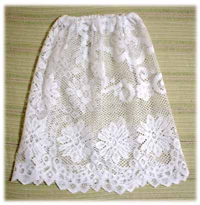 レースでできたドレスみたいなスカートです。 100円ショップのテーブルクロスを二つに切って作ってあります。 安上がりなものですが、女の子は目を輝かせて喜びます。