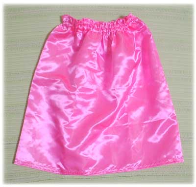 サテンのスカート ピンクのサテン生地で作ったスカートです。 ツルツル・ピカピカでゴージャスな感じがでているでしょうか? サテンは、細い三つ折りなどの裾の始末がしにくいので、 裾は二つ折りにして、あえて赤い糸を使い、ミシンの刺繍縫いの機能を使って始末してあります。 ちょっと可愛さアップできたかな? 10cmあたり39円のサテン生地を50cm使っています。 これでも材料費は200円以下。 市販のドレスセット(プリンセスセット?)を思えば、ちょっと工夫して作ってみる価値はあると思いますよ。 お母さんの手作りは、子どもも絶対喜びます!