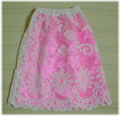 スカート レースでできたスカートです。 ドレス(ロングスカート)より少し短め。 こんな風に色んなバリエーションが楽しめます。 これも100円ショップのテーブルクロスの半分使っています。 とにかく安いし(^_^)、お手軽にできるので、 気軽に作ってあげてくださいね。