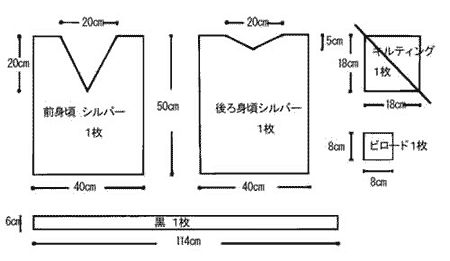 ライダースーツの作り方 1. 材料 ナイロン生地・・・シルバー 50cm×80cm キルティング生地・・・シルバーなど 18cm×18cm 綿生地・・・黒 6cm×114cm ビロード生地など・・・黄 8cm×8cm バイアステープ・・・黒 2. 型紙イメージ 3. 作り方 首ぐりをバイアステープでくるむ。 黒い布をラインの長さに切り、両脇を7mmずつ折っておく。 ラインを縫い付ける。 中心に黄色のマークを縫い付ける。 肩パットの直角2辺をバイアステープでくるむ。 前身ごろ・後ろ身ごろの肩を合わせて、縫う。 肩パットを、中表に、肩に縫い付ける。 脇を縫いあわせる。肩周りを20cm、開けておく。 肩パットを表に返し、袖ぐりを一周縫う。