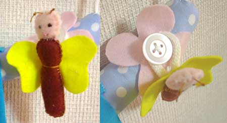 ちょうちょ ちょうちょの拡大写真です。普段は右上のボタン(ここも花のかたちになっています)にかけておけます。洗えるフェルト製です。