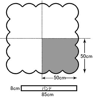 ヴェールの作り方 1. 材料 レースのテーブルクロス・・・100cm×100cm (100円ショップにて購入・4枚分とれる) 綿生地・・・ピンク系 8cm×85cm ゴムひも・・・45cm 2. 型紙イメージ 3. 作り方 バンド用の布はぬいしろ1cmずつ内側に折り、アイロンをかける。 テーブルクロスは50cm×50cmの4等分にする。 バンドの両端を中表に縫いあわせて、輪にする。 レースの1辺をバンドで挟み、1周縫う。ゴム入れ口は開けておく。 ゴムひもを通して、結ぶ。