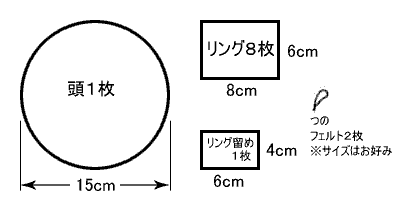 あおむしの作り方 1. 材料 ニット生地・・・黄・黄緑 フェルト・・・紫 綿ロープ・・・(太)15cm 綿 刺繍糸 2. 型紙イメージ 3. 作り方 頭の周囲をぐしぬいし、縫い縮める。 頭に綿を詰め、綿ロープの片側を入れて、縫いとめる。 角を縫い付け、表情を刺繍する。 綿ロープの先を挟んで、リング留めを筒に縫う。 4.をピンセットで裏返し、綿をつめて棒状にし、両端をかがる。 「マシュリング」を8個作る。 「マシュリング」の作り方1. 半返し縫いで、細長く、筒状に縫う。 ピンセットで裏返し、綿をつめる。 伸ばしながら、リング状にし、かがる。